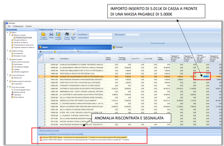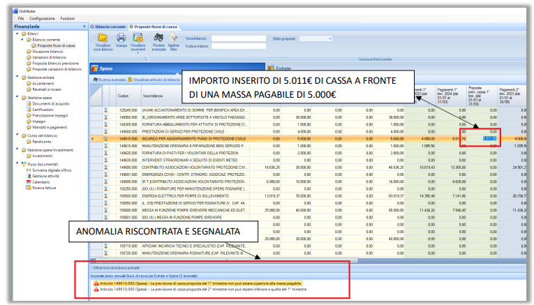 Durante la compilazione delle proposte verranno effettuati dei controlli sui dati inseriti. Nello specifico, per le spese i valori inseriti nei vari trimestri non potranno mai essere superiori alla colonna MASSA PAGABILE; per le entrate è previsto il medesimo controllo, ma chiaramente non è un’anomalia bloccante (solo un avviso).