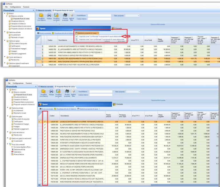 Per facilitare l’inserimento delle proposte è stato inserito l’automatismo per il quale redigendo in un trimestre una proposta di cassa pari al totale della colonna “Massa pagabile” / ”massa incassabile”, in automatico tale importo viene propagato su tutti i trimestri successivi (essendo i dati cumulativi e non potendo avere una cassa maggiore della massa pagabile). A mano a mano che vengono compilati i vari importi di proposta della cassa è necessario segnarli come “confermati” tramite il pulsante “Gestione proposte di cassa” → ”Imposta come confermate le proposte di cassa selezionate”. Questo procedimento risulta obbligatorio in quanto la Ragioneria dovrà verificare le proposte che i vari uffici avranno confermato.