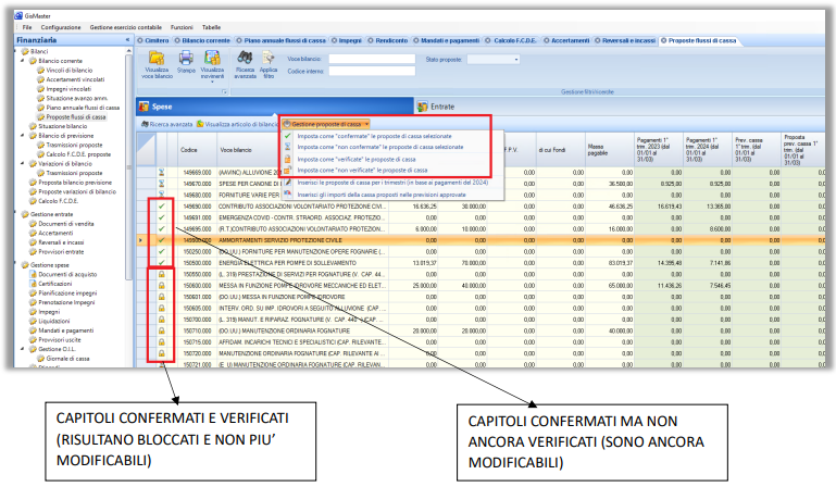 A mano a mano che le previsioni vengono verificate è necessario cliccare il pulsante che si trova sotto “Gestione proposte di cassa” → ” Imposta come verificate le proposte di cassa”. Questa operazione farà in modo che nessuno possa più modificare tali previsioni (contrassegnate con l’icona del lucchetto).