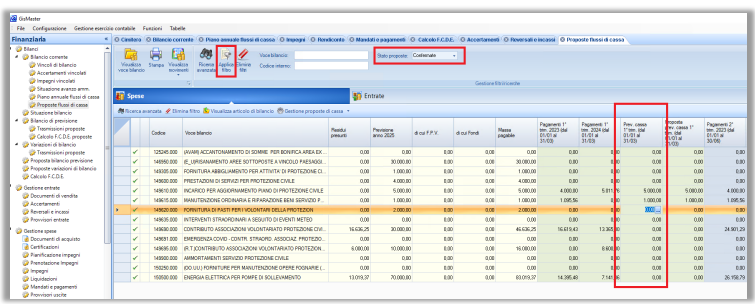 Per ciascun articolo è necessario compilare la colonna “Previsione cassa N trimestre” (colonna a fianco della proposta).