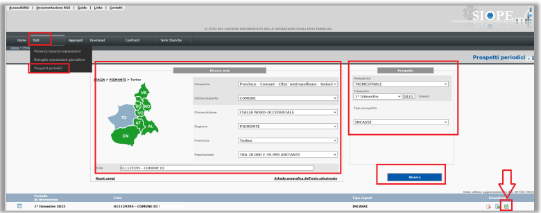 Il modello del piano annuale dei flussi di cassa redatto dalla R.G.S. prevede la presenza degli incassi/pagamenti dell’anno 2023 caricati sul sito www.siope.it. Per cui, per prima cosa, è necessario scaricare i file CSV di incassi e pagamenti dei 4 trimestri 2023 dal sito www.siope.it inserendo i parametri di ricerca che vedete nella foto qui sotto.