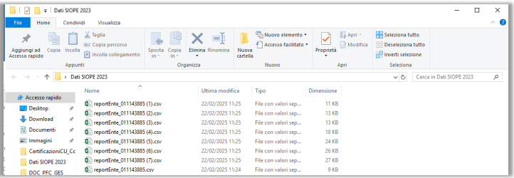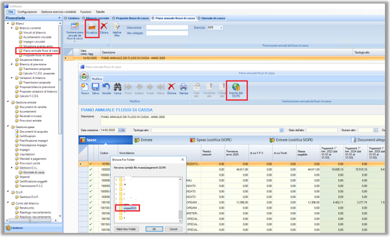 Terminato lo scarico è necessario andare nel menu del “Piano annuale flussi di cassa” e aprire quello già creato. Nella barra in alto si deve cliccare il pulsante “Importa dati SIOPE”, il quale aprirà una finestra in cui bisognerà scegliere la cartella precedentemente creata contenente i files CSV da importare. Selezionata la cartella, avverrà in automatico l’importazione degli incassi e dei pagamenti 2023 suddivisi per trimestre.