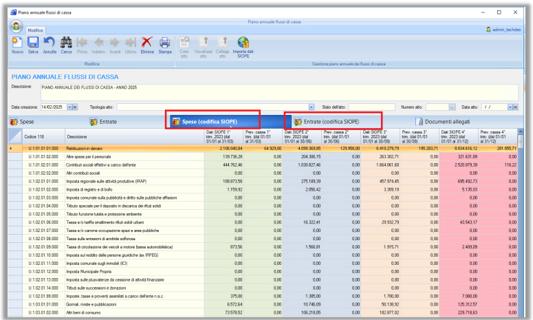 Terminata l’importazione, i dati saranno consultabili nelle due schede “Spese (codifica SIOPE)” ed “Entrate (codifica SIOPE)”. A differenza di prima qui si vedranno le previsioni di cassa 2025 inserite raggruppate per codice SIOPE di 4° livello in relazione agli incassi/pagamenti 2023 scaricati ed importati.