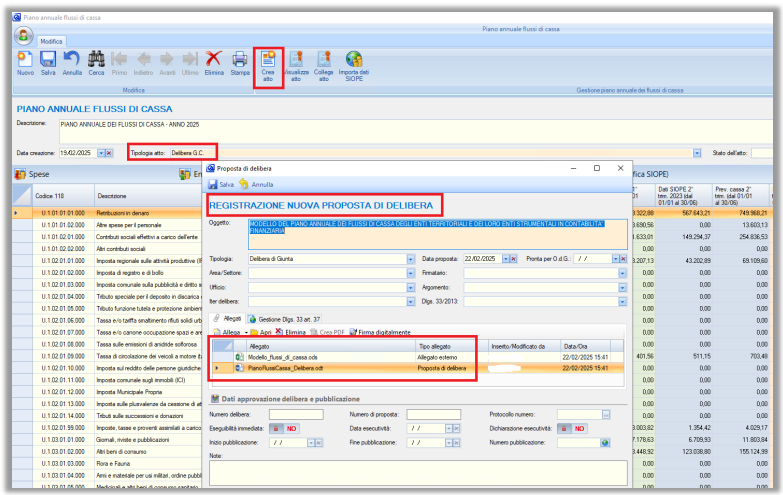 Terminata la compilazione di tutte le previsioni di cassa di entrate e spese dall’apposita sezione “Proposte flussi di cassa”, è possibile procedere alla creazione del documento finale “Modello del Piano Annuale dei Flussi di Cassa degli Enti Territoriali e dei loro Enti Strumentali in contabilità finanziaria di cui all’art. 1, comma 2, del decreto legislativo 30 marzo 2001, n. 165” e della relativa proposta di Delibera di Giunta Comunale che dovrà essere approvata entro il 28 Febbraio 2025.