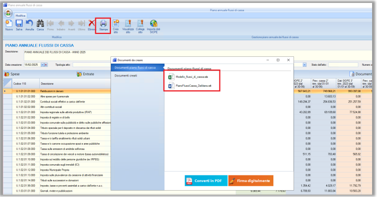 I prospetti finali si creano cliccando sul pulsante “Stampa”: qui sarà possibile trovare sia il modello Excel del piano annuale dei flussi di cassa, sia il testo della proposta di delibera. Quest’ultima essendo una bozza rimane totalmente modificabile in base alle esigenze dell’ente.