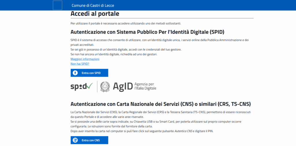 Per l’accesso al portale c’è la possibilità di autentificarsi tramite SPID o CNS