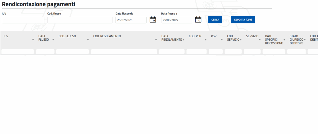 Effettuata la ricerca tramite il tasto ESPORTA(CSV) è possibile salvare in formato .csv l’elenco dei pagamenti ricercati