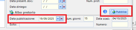 Tornare sulla scheda “Rilascio provvedimento finale”, indicare la data pubblicazione odierna e cliccare su pubblica: in automatico verranno inseriti i campi “Num. giorni” (di default 15) e “Data. scad”