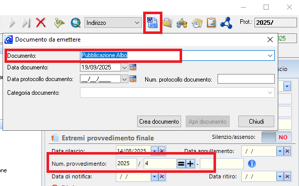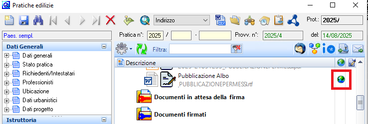 Una volta rilasciata la pratica edilizia e inserito il numero di rilascio nella scheda “Rilascio provvedimento finale”, generare il file da inserire sull’albo pretorio:
