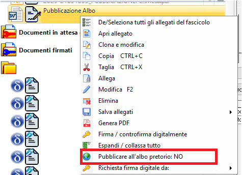 Nel caso non ci fosse, si può scegliere, cliccando con tasto destro e scegliere l’opzione “Pubblicare all’albo pretorio”: