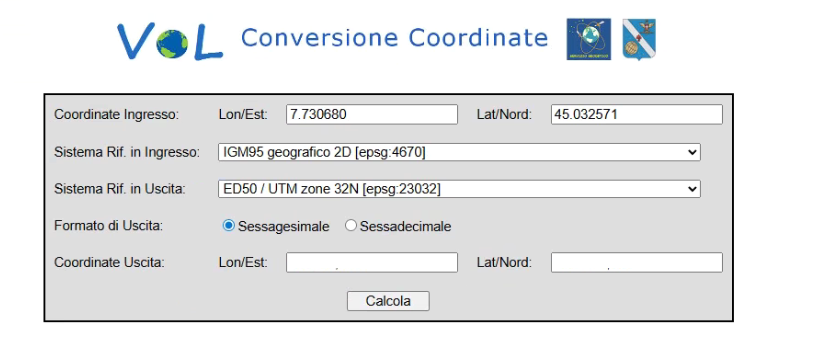 Inserire le coordinate in ingresso, e selezionare i sistemi di riferimento come indicato nell’immagine, e cliccare su calcola: